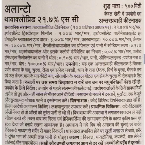As a chemical-class insecticide with a Yellow toxicity rating, Alanto requires standard precautionary handling while offering consistent and strong performance. Farmers trust Alanto for its reliability, effectiveness, and ability to safeguard crops from pest attacks throughout critical growth stages.