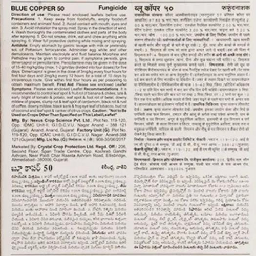 Blue Copper Fungicide by Crystal Crop Protection is a chemical fungicide formulated with Copper Oxychloride 50% WP. It provides effective protection against a wide range of fungal diseases in crops. Classified under the chemical category with a Blue toxicity label, it is considered relatively safe when used with standard precautions.